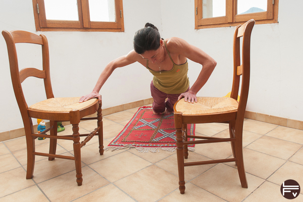 Placez deux chaises face à face, écartées de la largeur de vos épaules. Prenez appui, une main sur chacune des assises, les talons posés au sol, devant vous. Effectuez des répulsions.