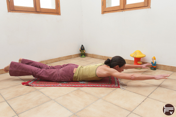 Allongé, face au sol, soulevez légèrement les épaules et les jambes tendues, puis maintenez la position. L’exercice devient plus dur si vous étirez les bras devant la tête.