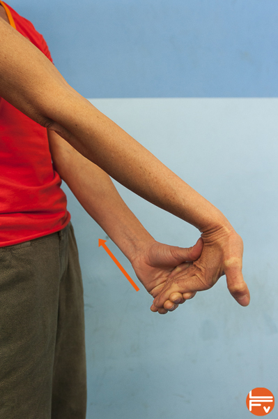 Placez vos bras fléchis à 90° devant vous ; croisez-les au niveau des coudes, puis au niveau des poignets. Les mains se retrouvent alors face à face. À partir de cette position, mains verrouillées, cherchez à tendre les bras.