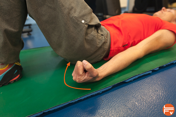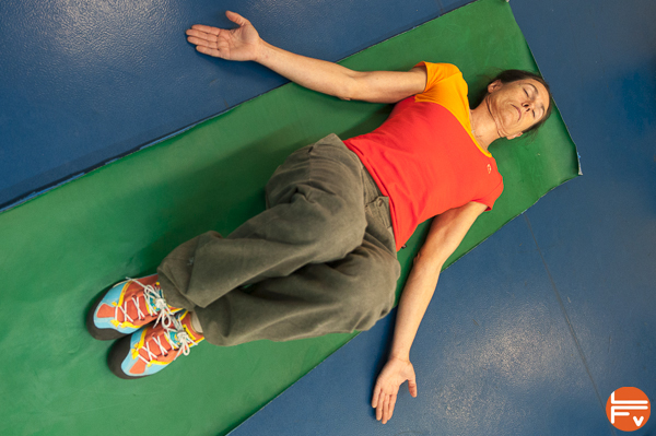 Allongé, les jambes en crochet. Faites dans un premier temps en sorte d’aplatir les courbures lombaires et cervicales : Sur chaque expiration, plaquez au sol le bas du dos et la nuque en rentrant le menton. Les bras reposent sur le sol, à 45°, paumes de mains dirigées vers le haut. Déroulez ensuite les épaules, en maintenant les lombes et cervicales plaquées. Toujours sur chaque expiration, et en maintenant les corrections précédentes, faites glisser les mains vers les jambes, puis enroulez les poignets et maintenez la position.