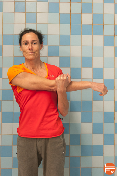 Pour un étirement côté droit : Debout, saisissez votre bras droit avec la main gauche, puis exercez doucement une traction vers la gauche, sur l’expiration.