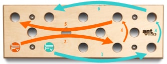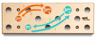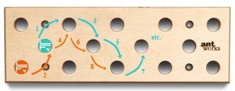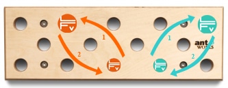 Littéralement traduit, pegboard signifie, « planche à chevilles » : il s’agit en effet ni plus ni moins qu’une planche garnie de gros trous, placée sur un plan vertical ou légèrement déversant, sur laquelle on va se mouvoir en déplaçant des chevilles. Certaines vidéos montrent des installations aux dimensions imposantes. Il existe toutefois des dispositifs plus modestes, adaptés à un environnement quotidien. C’est ce que propose la société Antworks, située en Autriche. Différents modèles sont disponibles, de dimensions variées, à installer verticalement ou horizontalement. C’est la Ant Hill 53, adaptable au-dessus d’une porte, que La Fabrique Verticale a testé pour vous.